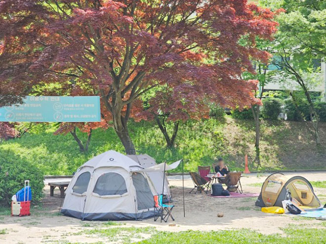 2~4인용 원터치 텐트만 설치 가능하며, 땅에 박는 모든 설치물(타프, 그늘막, 로프, 펙, 파라솔 등)의 경우 설치가 불가합니다.
