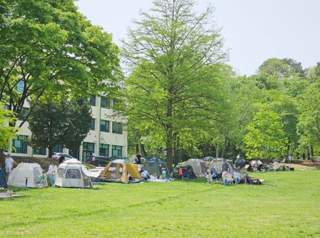 생활 1980 건물과 주차장 1 사이에 위치한 사색의 동산은 약간 경사진 잔디밭으로 이루어져 있었지만 규모가 넓어 아이들이 뛰어놀기에 좋고 나무 그날이 많아서 텐트를 치고 피크닉 즐기기 좋은 곳이에요