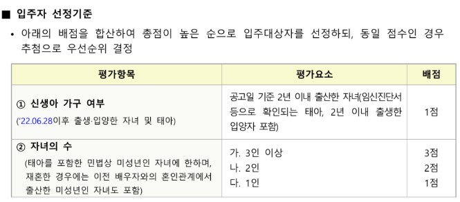 ▶ 입주자 선정기준 : 배점을 합산하여 총점이 높은 순으로 입주대상자를 선정하되, 동일 점수인 경우 추첨으로 우선순위를