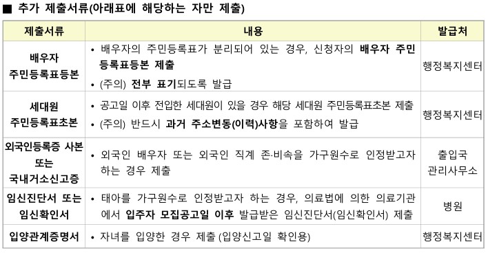 • 신청자(무주택세대구성원)와 배우자가 주민등록이 분리된 경우 배우자 및 배우자와 동일한 주민등록표 상에 등재되어 있는 신청자(세대주)의 직계존・비속이 누락되는 일이 없도록 주의하시기 바랍니다.