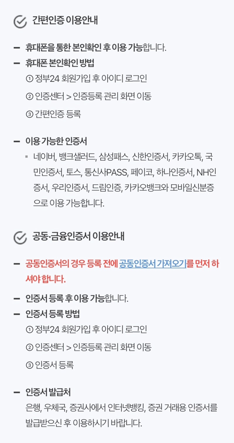 그리고 정부24 아이디나 인증서가 없으시면 PASS를 먼저 등록하시는게 조금 더 수월하실 거같아요