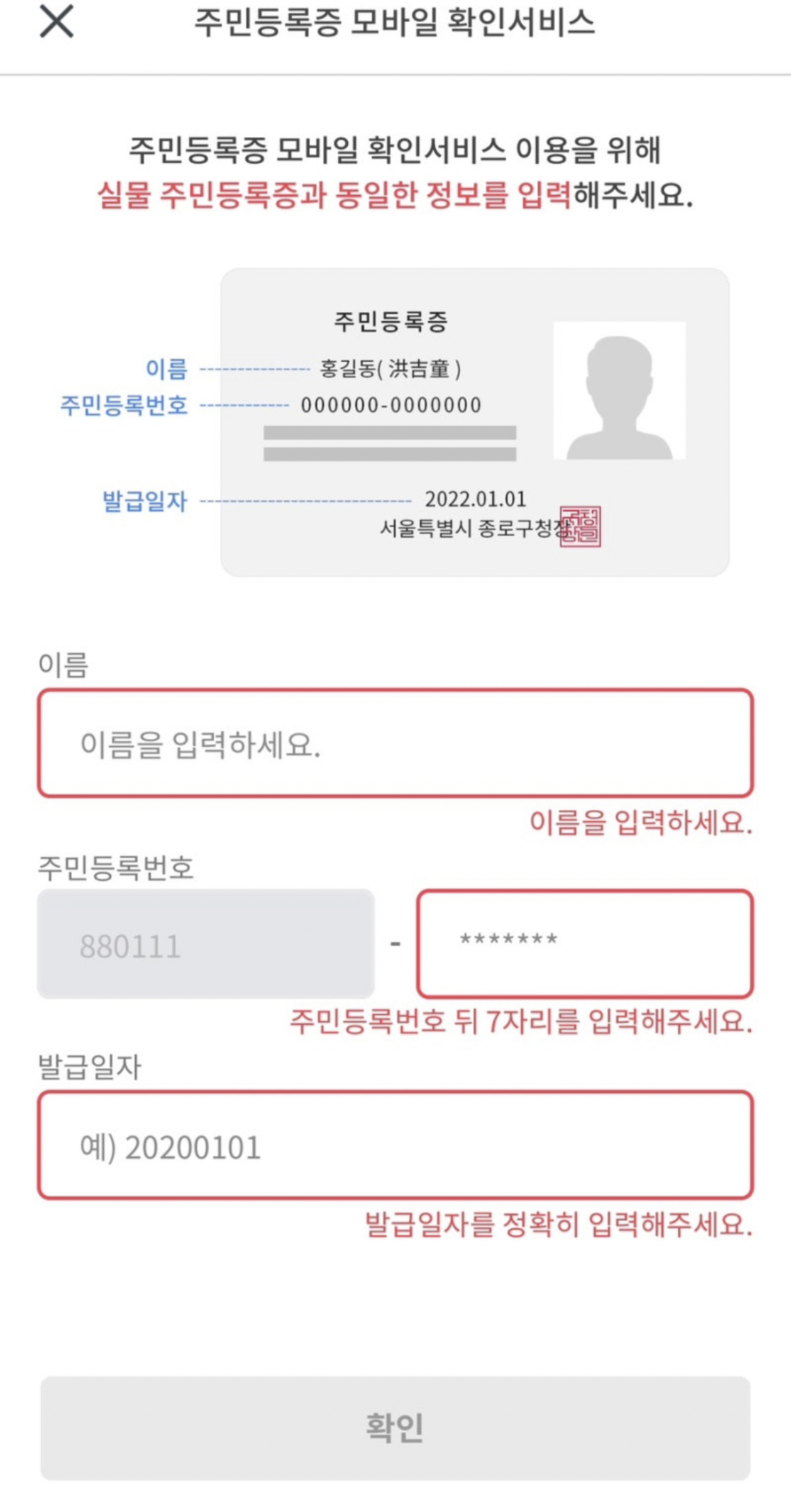 5. 주민등록증 모바일 확인서비스 이용을 위해 실물 주민등록증과 동일한 정보를 입력해주세요!