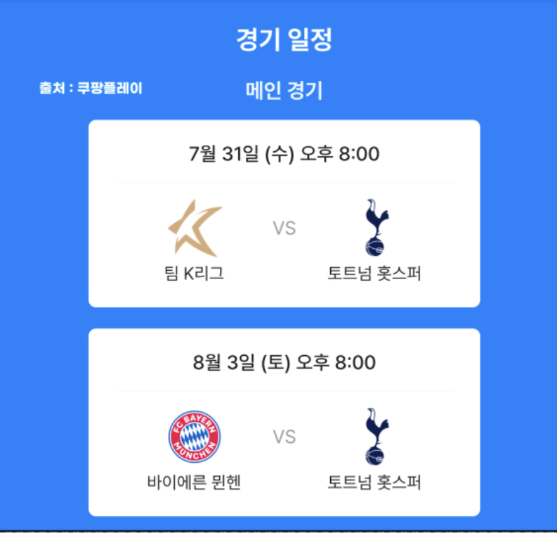팀 K리그와 토트넘 간 친선경기는 지난 2022년 쿠팡플레이 시리즈 첫 대회에 이어 두 번째 열리는 경기로 큰 기대를 모으고 있습니다. 주장 손흥민이 이끄는 토트넘은 31일 팀 K리그와 경기에 이어 오는 8월 3일 바이에른 뮌헨과 경기를 펼친 뒤 다시 영국으로 돌아간다. 8월 11일에는 홈구장인 토트넘 홋스퍼 스타디움에서 뮌헨과 마지막 프리시즌 경기를 갖고 시즌 일정을 마무리한다. 유럽에 가서 봐야 할 구단들을 한국에서 그것도 서울월드컵경기장에서 경기하는 모습을 볼 수 있다니 벌써부터 축구팬으로서 너무나도 기대가 됩니다.