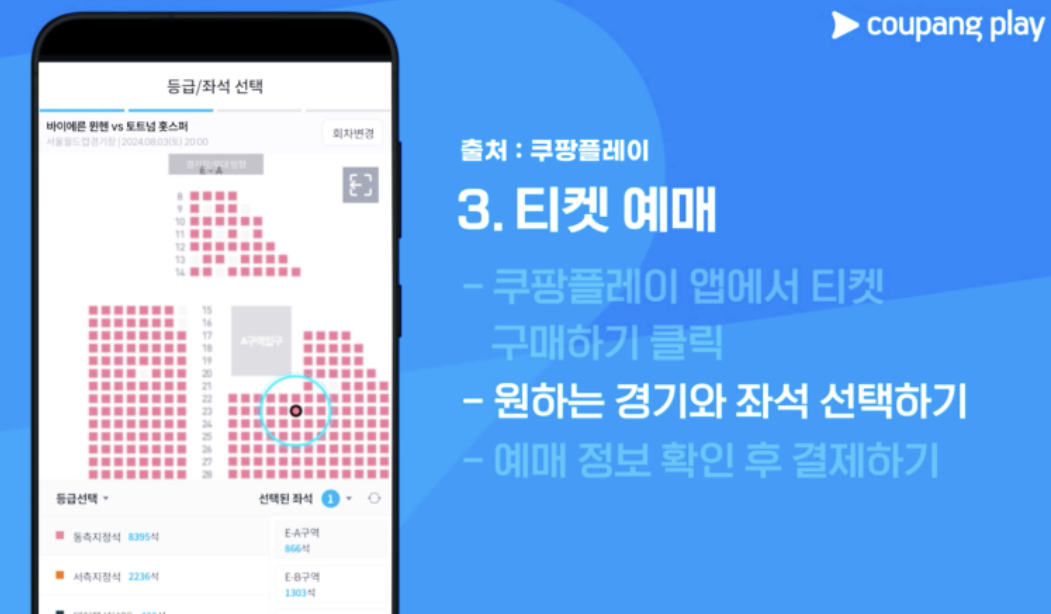 3. 쿠팡플레이 앱에서 ‘토트넘 뮌헨’ 경기 또는 ‘팀 K리그 토트넘’ 예매창을 클릭하여 줍니다.