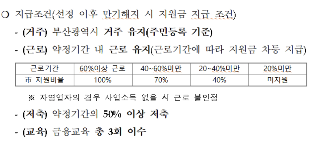 • 부산청년 기쁨 두 배통장 사업은 선정 후부터 만기 시까지 주소지가 부산시여야 하며, 근로 유지 및 교육이수 등의 요건이 충족된 경우 지원금을 지급하는 사업입니다. 약정요건이 충족되지 못한 경우 중 도해지될 수 있으며, 매칭 지원금은 지급되지 않습니다.