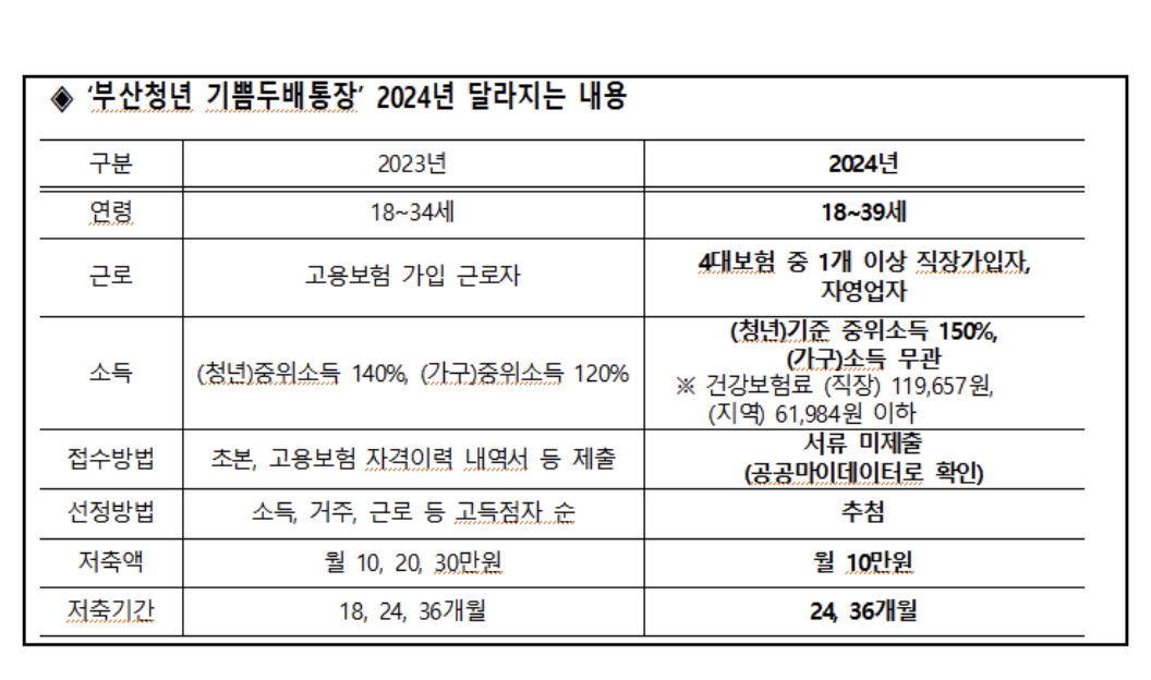 2024 부산청년 기쁨 두 배통장은 부산시에 거주하는 일하는 청년이 매월 10만 원을 24개월 또는 36개월 만기로 저축을 하면 본인 저축액과 동일한 금액을 부산광역시에서 지원해 주는 청년 두 배통장이라고 해요.